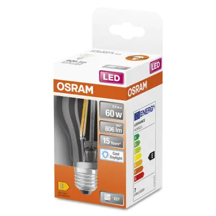 Description Osram Classic LED E27 Poire Filament Claire 6.5W 806lm - 865 | Remplacement 60W